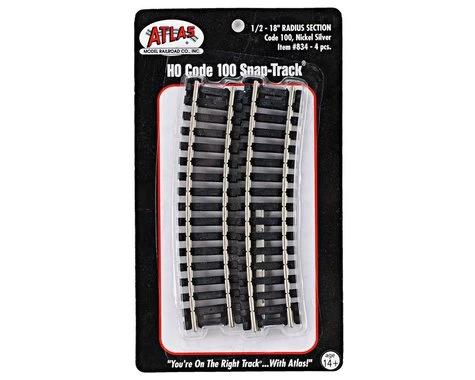 This is a pack of four Atlas Model Railroad HO-Gauge Code 100 18″ Radius 1/2 Curves.