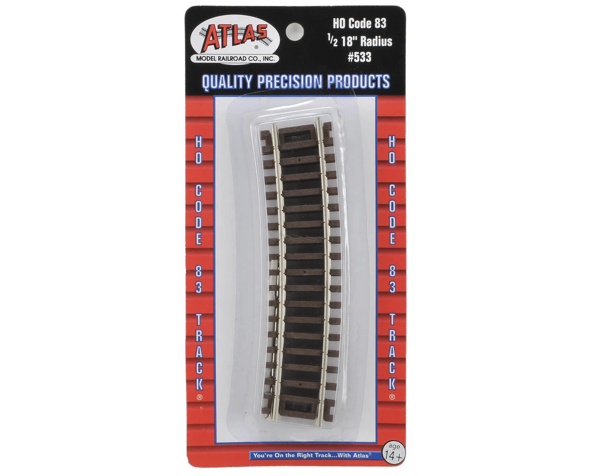 This is a pack of four Atlas Model Railroad HO-Gauge Code 83 Snap-Track 18″ Radius 1/2 Curves. Atlas’ code 83 line is high quality, prototypical track for the modeler who is looking for track that is more exact-to-scale than code 100. Atlas code 83 track has fine brown ties and smaller nickel rail. An advantage to Atlas code 83 track is its reasonable price. With Atlas you know you are getting the best-looking, most affordable code 83 on the market!