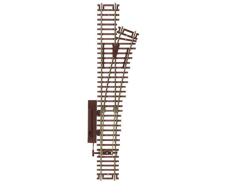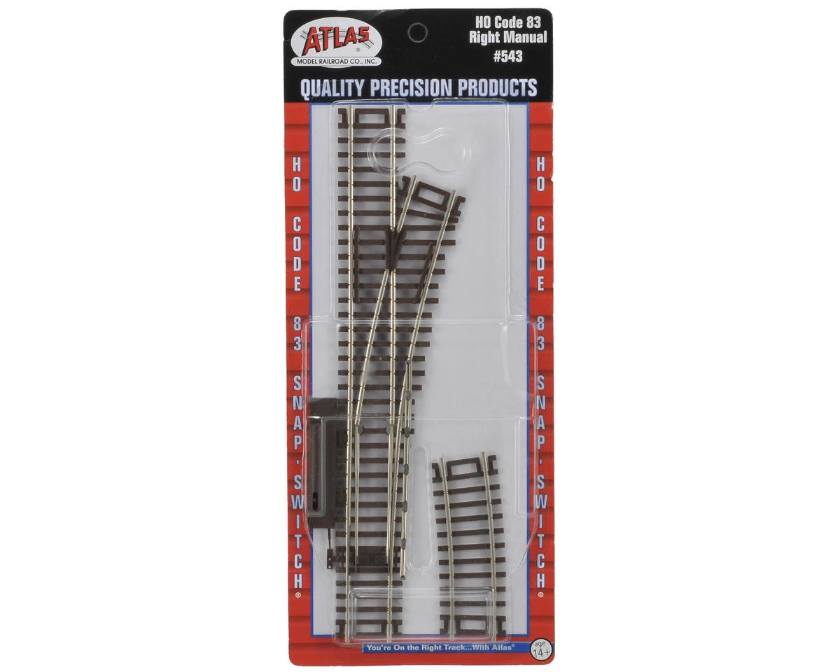 This is a Atlas Model Railroad HO-Gauge Code 83 Snap-Track Manual Right-Hand Switch. Manual switches can only be “thrown” (changing thedirection of the rail) by flipping a lever on the switch by hand. ManualCode 83 Snap Switches can be easily converted to remote control withLeft-hand (ATL584) and Right-hand (ATL585) switch machines. All HO Code 83 Snap-Switches are designed for above or undertable switch machine.