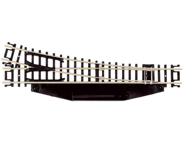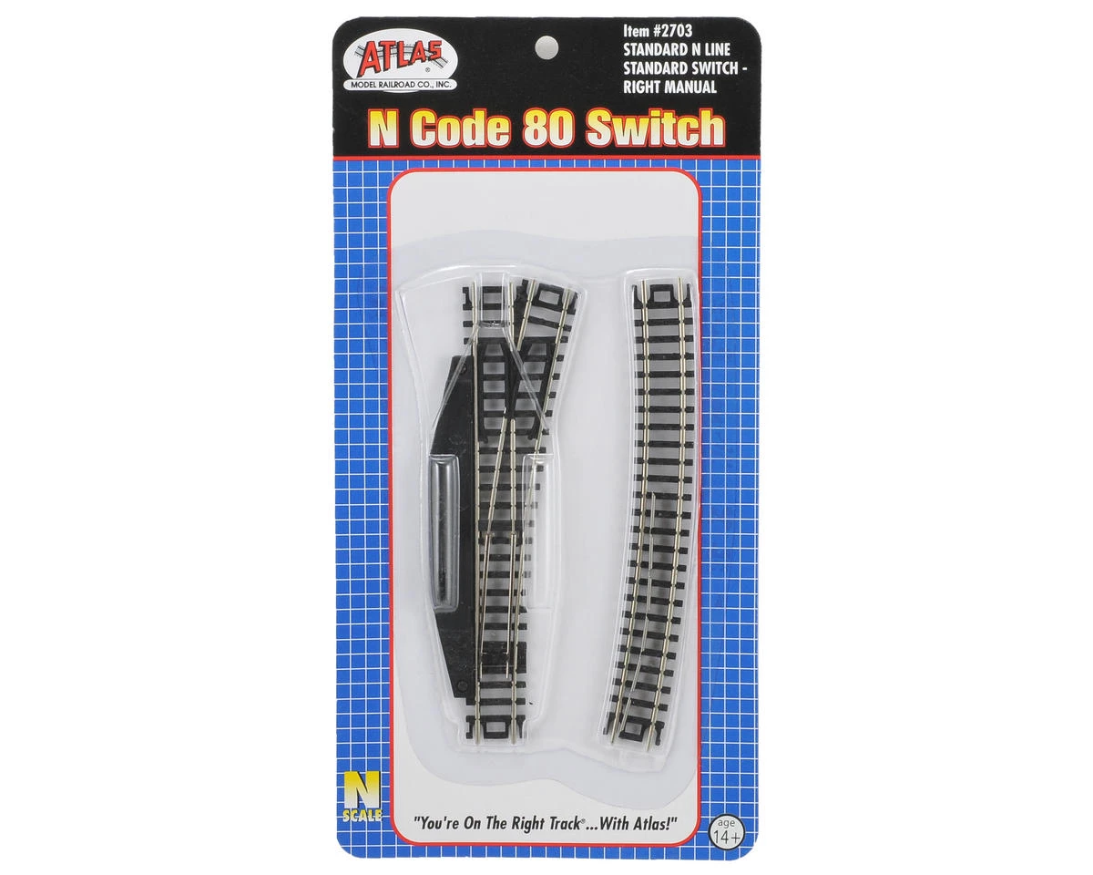 This is an Atlas Model Railroad N-Gauge Code 80 Manual Right-HandSwitch. Manual switches can only be “thrown” (changing the direction ofthe rail) by flipping a lever on the switch by hand. These Standard Nscale manual switches can be easily converted to remote control withan Atlas right hand switch machine (ATLU2716).