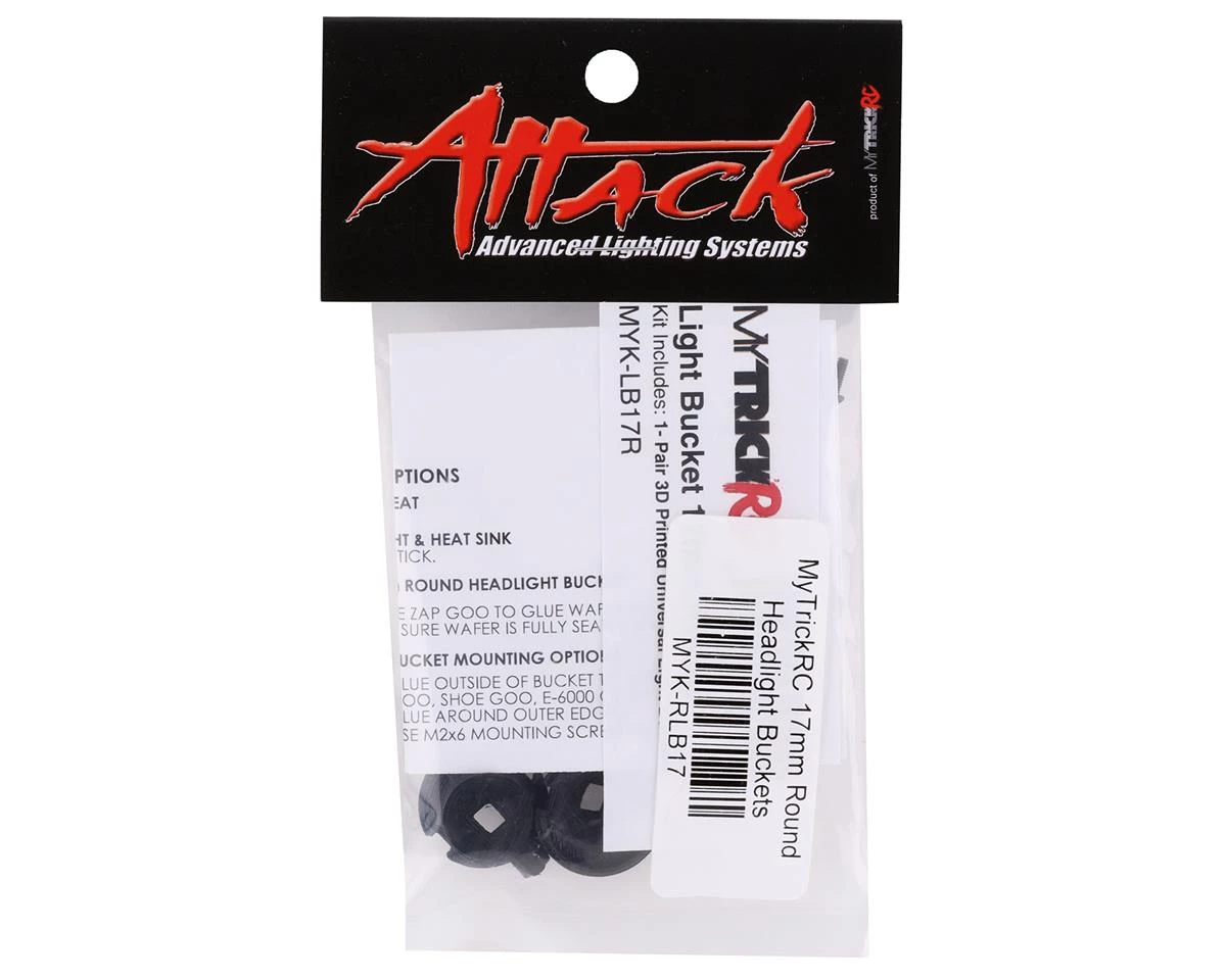 MyTrickRC 17mm Round Headlight Buckets. These optional headlight buckets are intended to give your Rock Crawler a custom look. When combined with the MyTrickRC Halo LED Headlights (MYK-AA17 – not included) you can achieve incredible detail. Package includes two light buckets.
