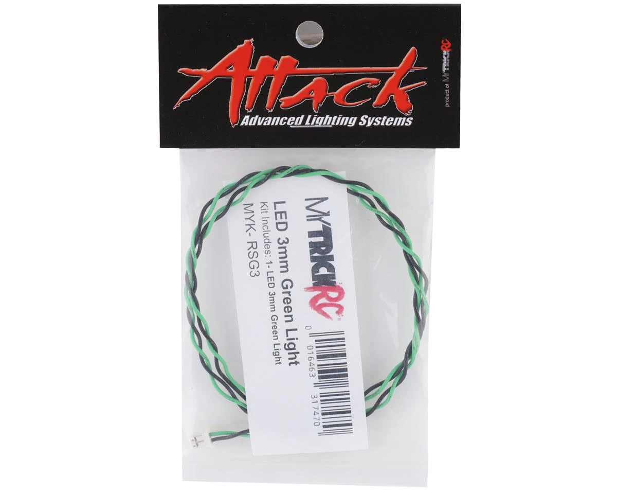 The MyTrickRC 3mm LED string is a single Green 3mm LED on a high quality 16″ cable, and is ideal for use on 1/10th vehicles. The super bright LED has been carefully chosen for optimum brightness, performance, and durability. Also, the twisted wires allow for an easier and cleaner install.