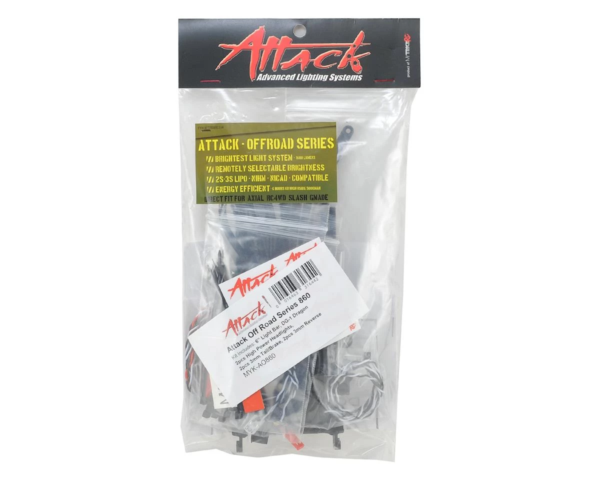 The MyTrickRC Attack Off Road 860 Series is a complete off road package. This high power 3S ready kit includes a waterproof 6″ light bar, headlights, red and yellow 3mm LEDs, all controlled from the 6 port DG-1 Dragon controller. Plus, if you have an open switch on your transmitter, the system can be plugged into an open receiver port and controlled directly from the transmitter!