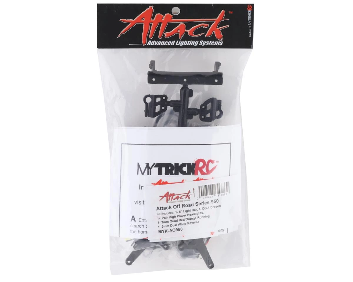 The MyTrickRC Attack Off-Road 950 Light Kit was born out of feedback from customers. The Attack Off Road 950 Kit is a slight upgrade over the Attack 850 Kit. The Attack Off Road 950 Kit adds front Running Lights, and is a perfect fit for the Axial XJ, HPI FJ, and Tons of Other Similar Vehicles that want Front and Rear Running Lights. With High Power, Remotely Controllable Adjustable Brightness RC Light System with 5″ Light Bar, Tail & Running Lights, and Reverse. This Plug and Play system is Simple to Install, Waterproof, and ready to take a beating on the Trail or on your Basher. The Kit includes multiple Mounts and is perfect for Scale Crawlers, Bashers, or any other project needing High Power Lights. With Remote, and Manual, Adjustable Brightness the Attack Off Road 950 Kit lets you manage your battery usage, and makes it WAY easier to get pictures of your Truck. Additionally, the LEDs in the Attack Off Road 950 Kit are Super Bright and have Wide Viewing Angle so they are Bright from Most Angles. This Rugged Kit is also very Expandable. You can easily add Lights Bars, Spot Lights, Headlights, or more Running Lights. No soldering required, everything is Plug and Play. The DG-1 Lighting Controller at the heart of the Attack Off Road 950 Kit is well proven, and loved by thousands RC enthusiasts like yourself.